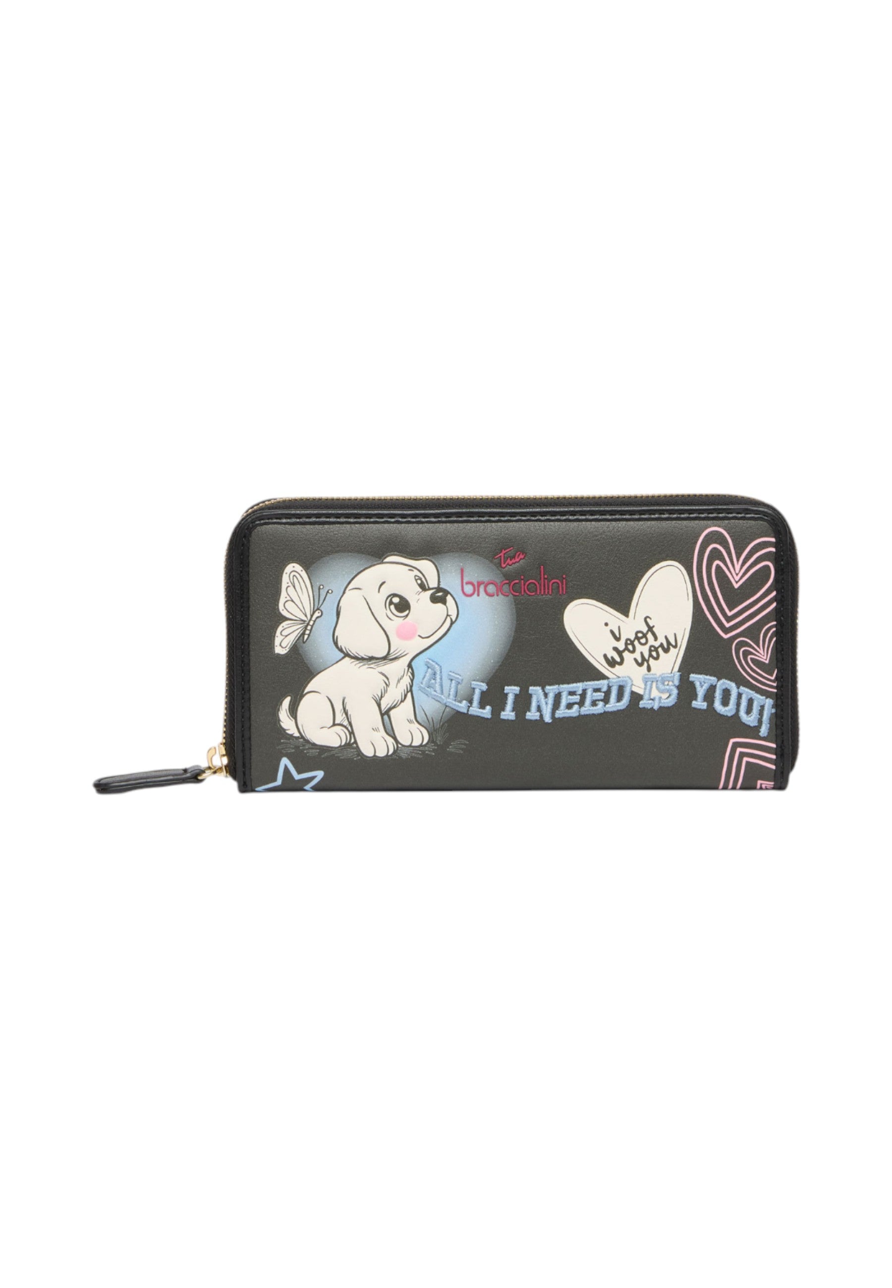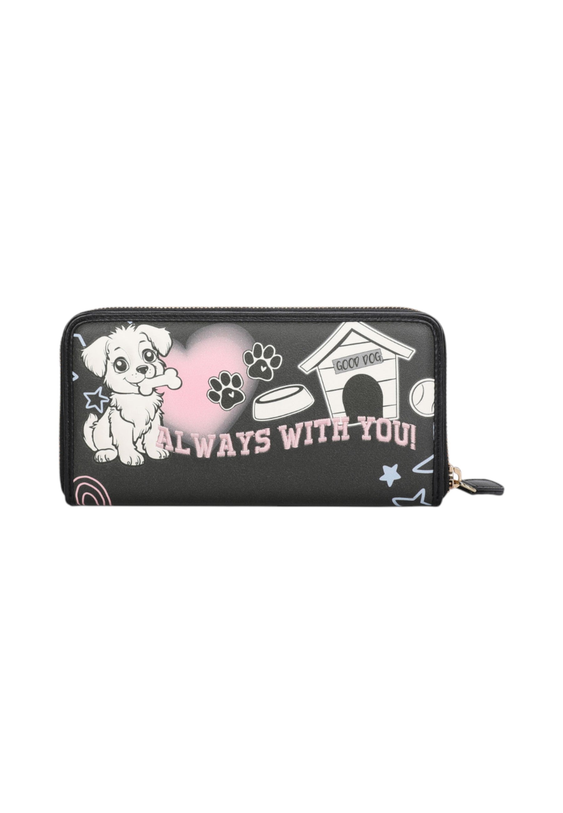Il design distintivo presenta adorabili dettagli ispirati ai cuccioli, rendendolo perfetto per le amanti degli animali. La chiusura con zip garantisce sicurezza e praticità, mentre gli spazi interni ben organizzati offrono ampio spazio per carte e contanti.