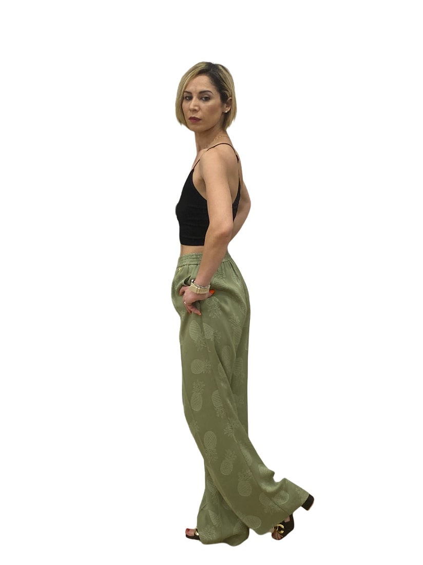 Pantaloni Donna Twinset 201TT246G0 are a stunning addition to any wardrobe. Crafted from luxurious jacquard fabric, these palazzo pants in an elegant oil green hue offer a unique blend of style and comfort.